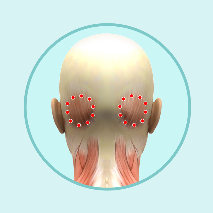 Стисніть руки в кулаки і розташуйте їх на виступаючих кістках черепа, з двох сторін від потиличної ямки. Масажуйте надавлюють круговими рухами.