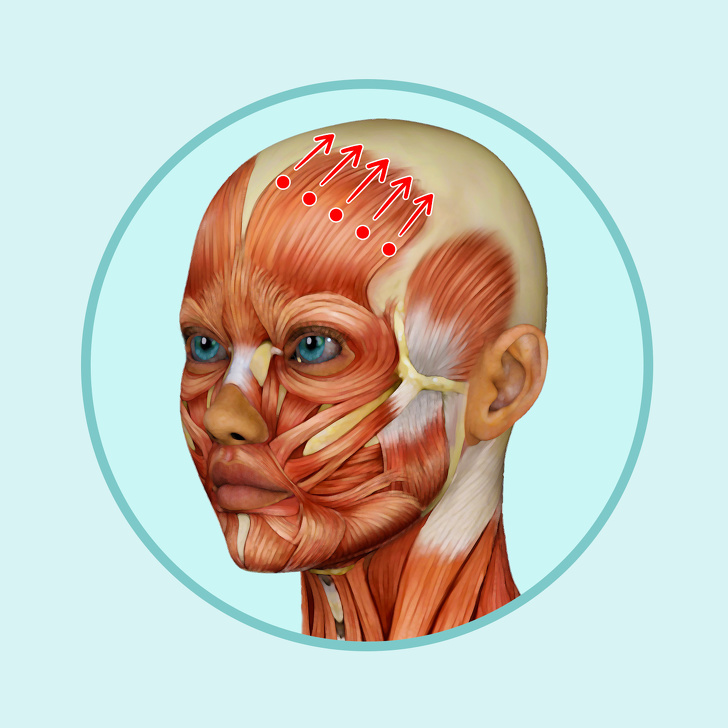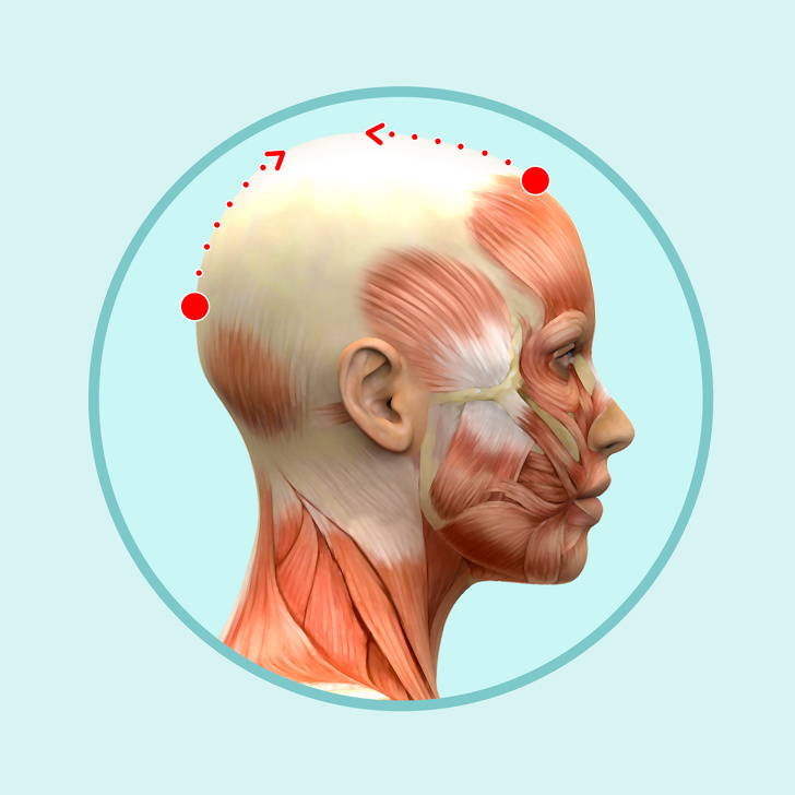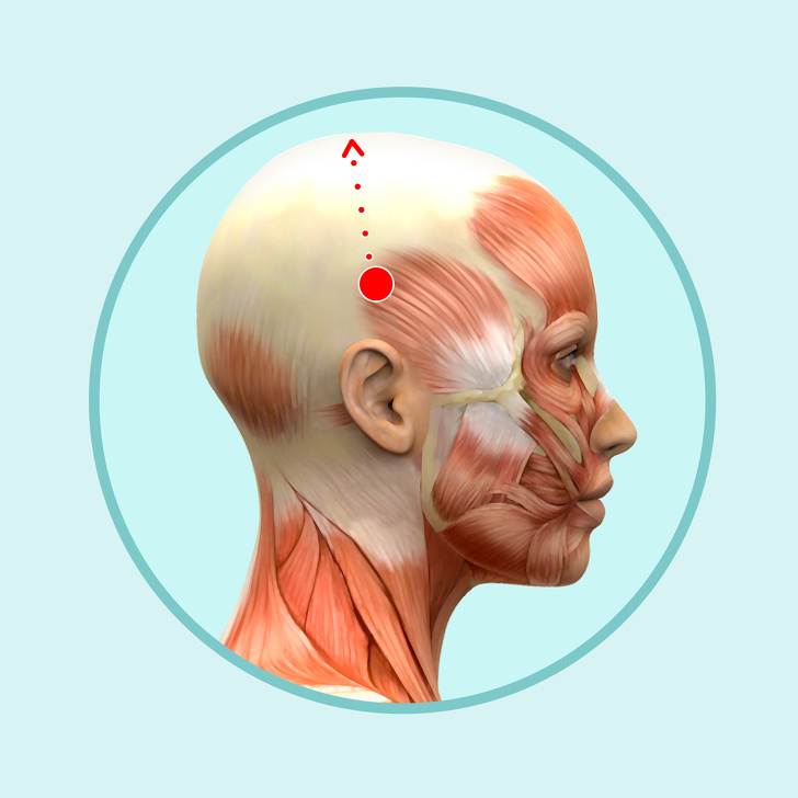 Розташуйте пальці обох рук на лобі, на межі росту волосся, і просувайтеся до верхівки, здійснюючи легкі натискальні і кругові рухи. Затримайтеся і сильніше промассируйте ті зони, в яких відчуваєте біль.