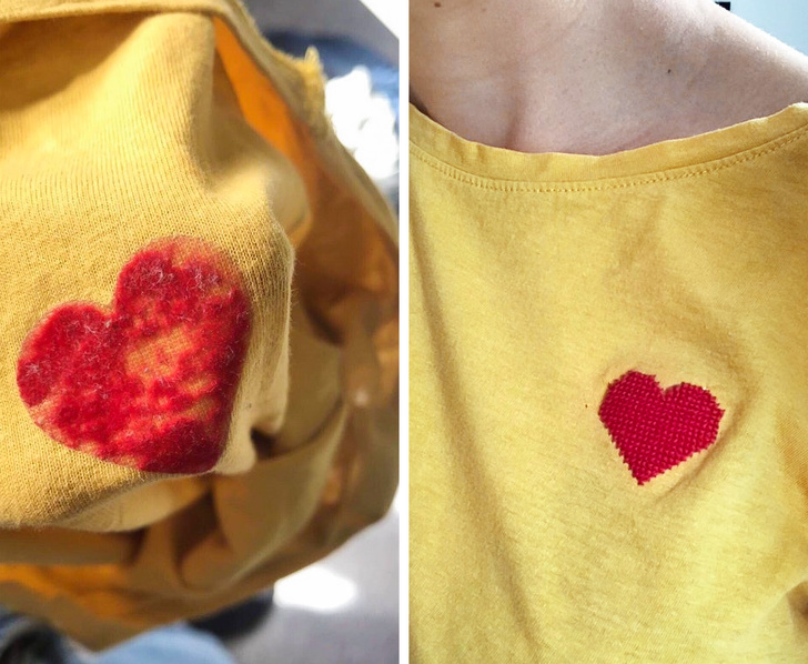 13. «Після прання оксамитове сердечко зіпсувалося, але, щоб не викидати футболку, я вишила нове серце хрестиком»