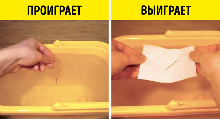 Що вам потрібно зробити: візьміть невеликий відрізок серветки або туалетного паперу, покладіть на нього голку і опустіть у воду. Конструкція залишиться на плаву. Швидше за все, після цього суперники звинуватять вас у тому, що голка лежить не на водній гладі, а на папері. Попросіть їх почекати. Адже незабаром серветка промокне і піде до одну, а голка залишиться рівно лежати на поверхні.