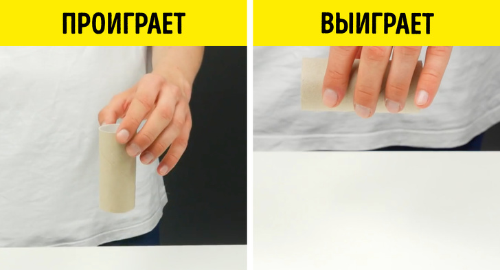 Що будуть робити опоненти: напевно вони спробують перед кидком тримати втулку в ідеально вертикальному положенні і кидати її на стіл зверху вниз. Ось тільки картонний предмет знову і знову буде перевертатися на бік.