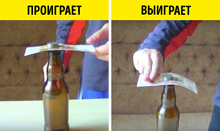 Мета: на столі стоїть пляшка, на шийці якої лежить купюра, придавленная башточкою з монет. Потрібно витягнути купюру так, щоб дрібниця не розсипалася.