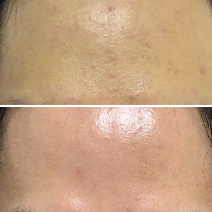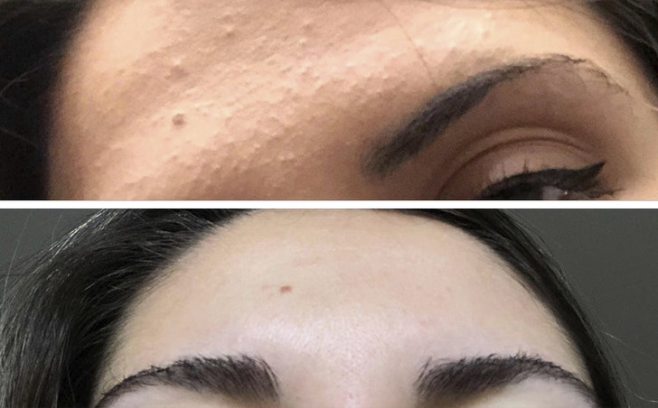 «Я позбулася закритих комедонов за 1 тиждень, використовуючи кошти з AHA-кислотами», — написала дівчина під ніком Genbex. Вона додала в свій догляд за шкірою кошти з гліколевої та молочної кислоти, і їй вдалося значно згладити горбистий рельєф на лобі. Ось як виглядав її щоденний догляд: