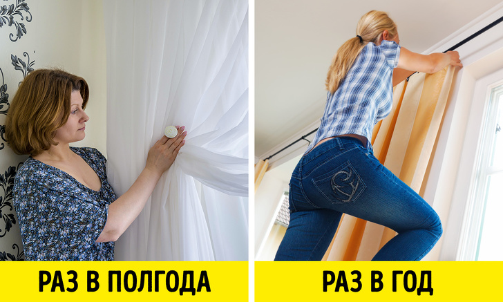 Щільні штори, які висять по краях вікон, можна освіжати лише раз в рік, при умови що ви регулярно їх пилососите, щоб на них не накопичувалися різні мікроорганізми, такі як пиловий кліщ.
