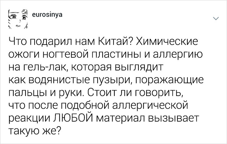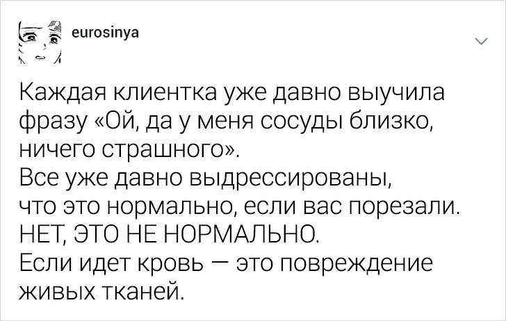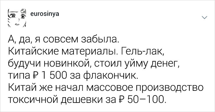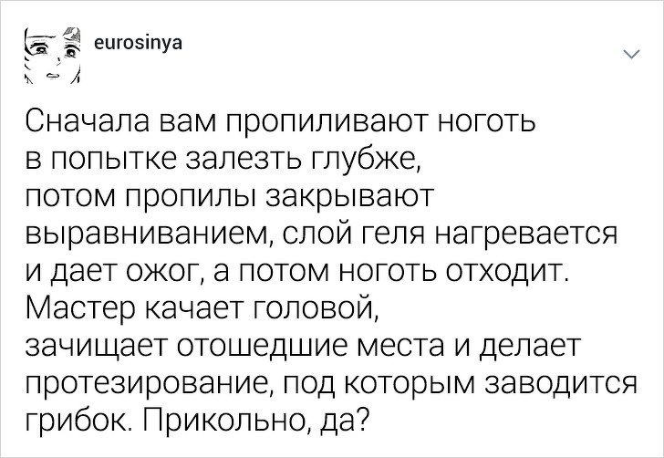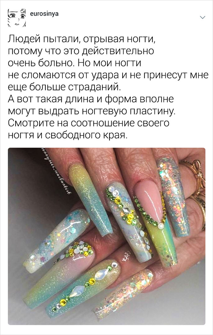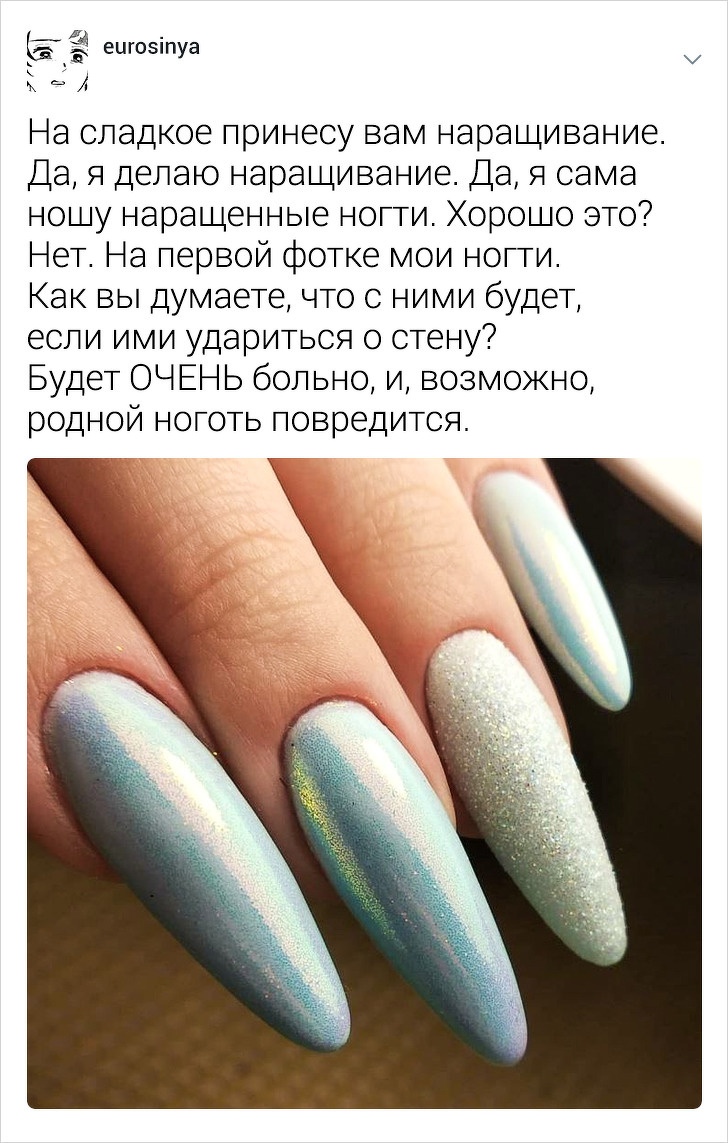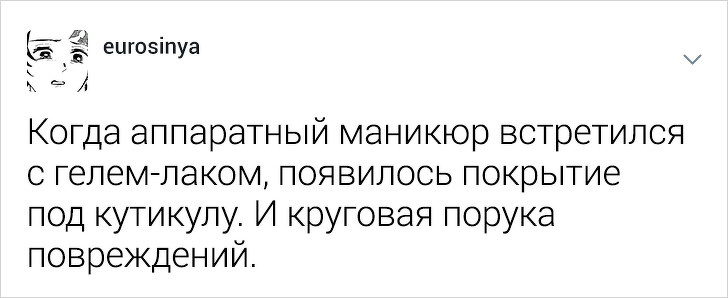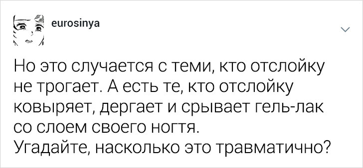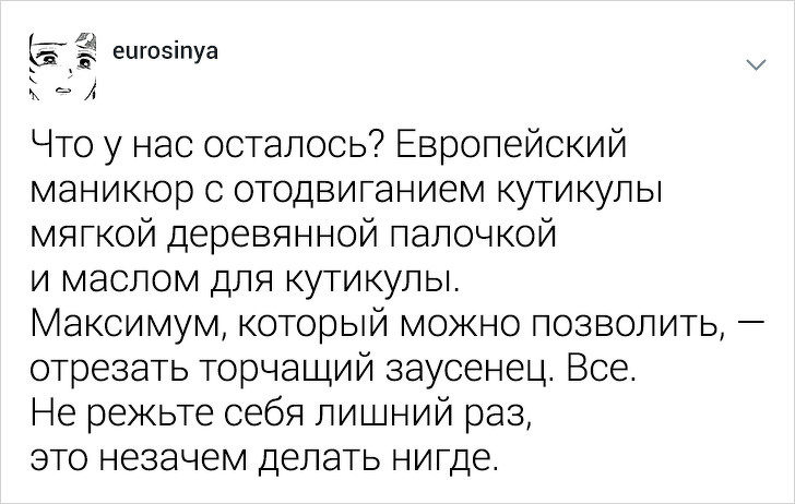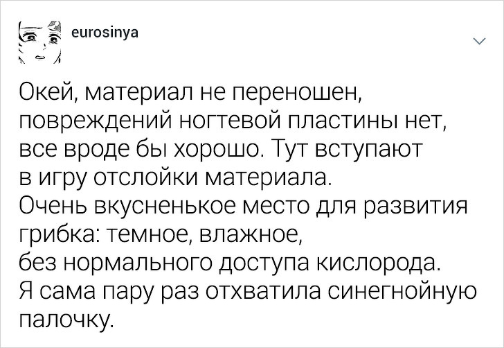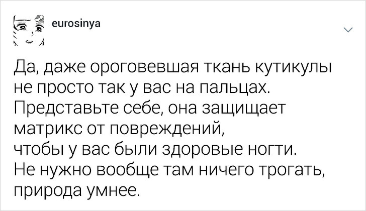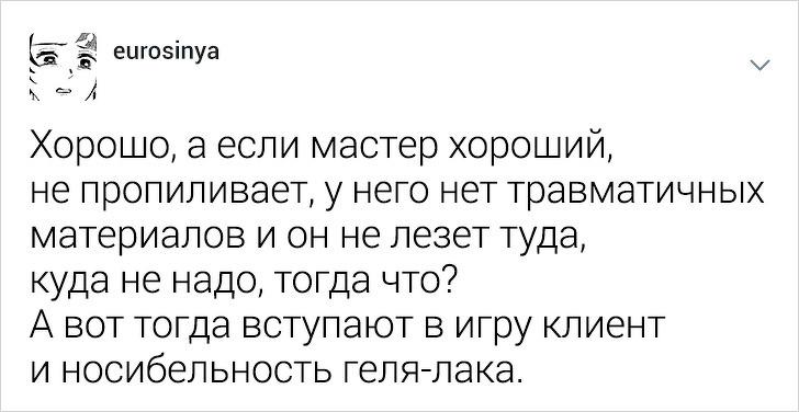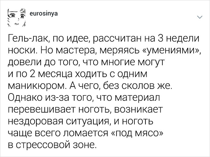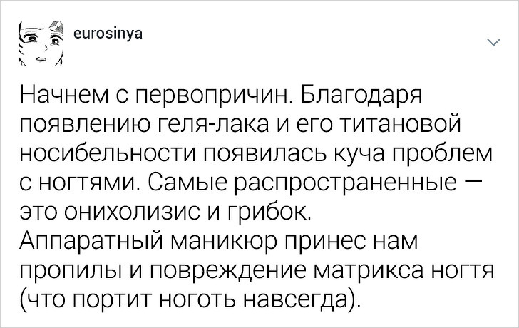 Користувачці твіттера під ніком eurosinya набридло спостерігати за непрофесіоналізмом своїх колег. Дівчина працює майстром манікюру і кожен день стикається з клієнтками, які впевнені, що гель-лак — це найкраще рішення, а порізи — це норма. Щоб розповісти, як насправді подбати про здоров'я нігтів, eurosinya написала тред в твіттері.