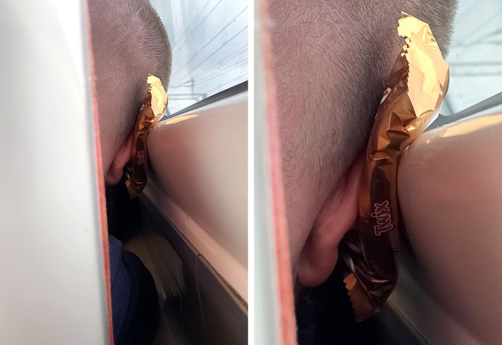 7. Цей хлопець використовує шоколадку Twix в якості дорожньої подушечки