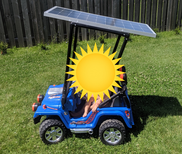 2. «Мені набридло постійно заряджати акумулятор машинки, тому я приробив сонячну панель. Тепер діти можуть кататися весь день (ну, якщо сонячно)»