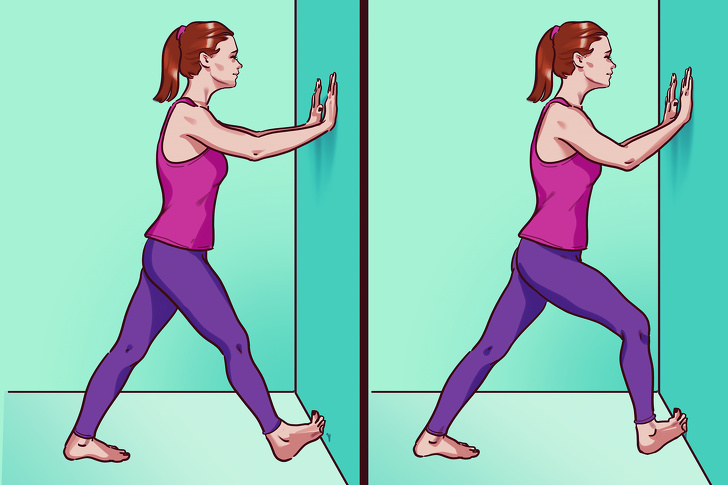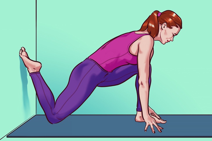 - Упріться носком ноги у стіну і зігніть коліно. Друга нога повністю стоїть на підлозі (не відривайте п'яту). Затримайтеся в такому положенні 30 секунд, а потім виконайте це ж вправу на іншу ногу.