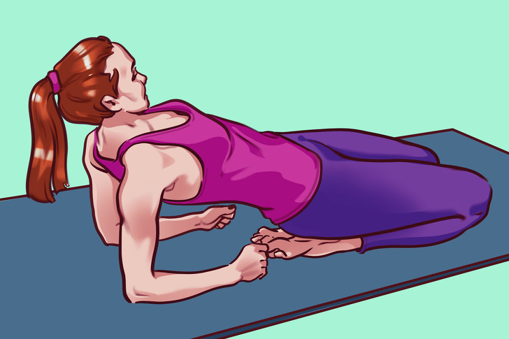 - Ляжте на живіт, потім підніміть плечі і схрестіть руки під грудьми.