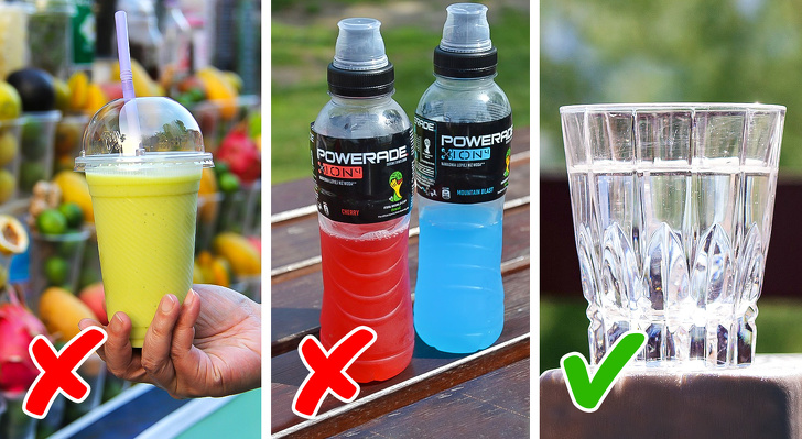 - В барі при фітнес-клубі рідко продається щось дійсно корисне. Наприклад, вітамінні смузі-коктейлі і фруктові фреші дратують голодний шлунок і призводять до гастритів, а звичайні соки і спортивні напої містять стільки ж цукру, скільки звичайна солодка газована вода. Здорова альтернатива — проста негазована вода.