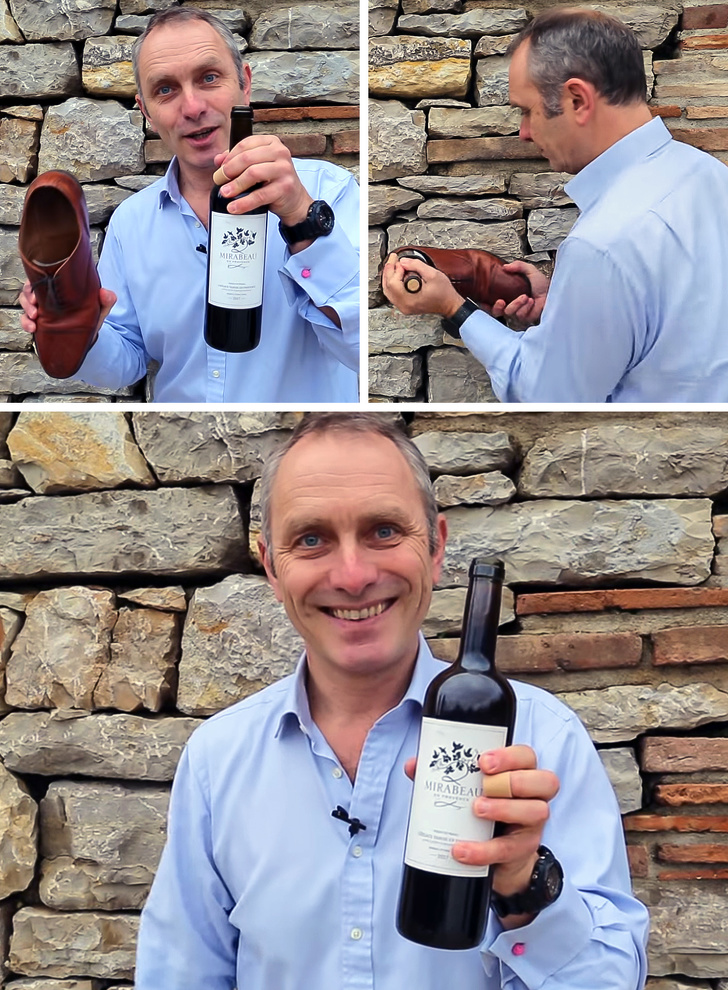 Для цього вам знадобиться черевик і трохи терпіння. Помістіть вино в черевик і постукайте по стіні: пробка вийде з пляшки без зусиль. Тут ви можете подивитися відеоінструкцію. Не забувайте про обережність. Людина на відео — винороб, і за своє життя він відкрив тисячі пляшок. Порівнюйте свої сили і не допускайте травм.