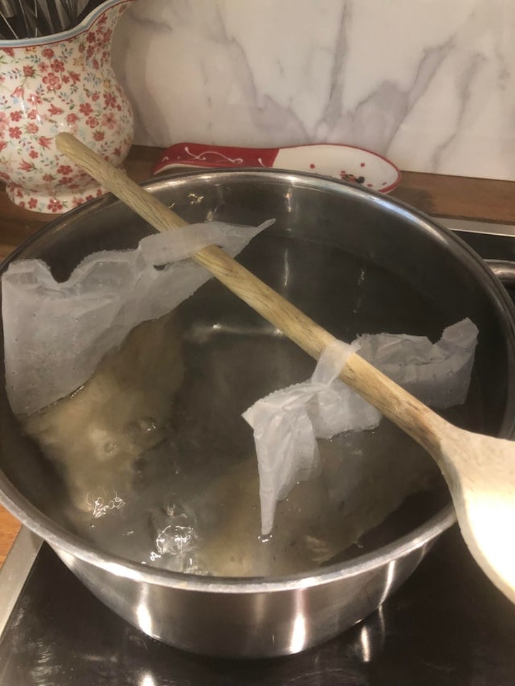 3. Пакетований рис можна варити з допомогою ополоники. Тепер вам не потрібно болісно довго виловлювати пакети з води