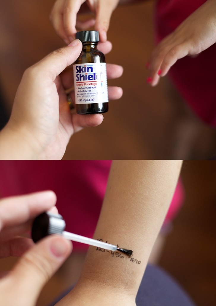 Напишіть на руці дитину телефон батьків і покрийте напис медичним клеєм для порізів. Якщо такого клею під рукою не виявилося, можна використовувати лак для волосся. Докладніше про спосіб розказано тут.