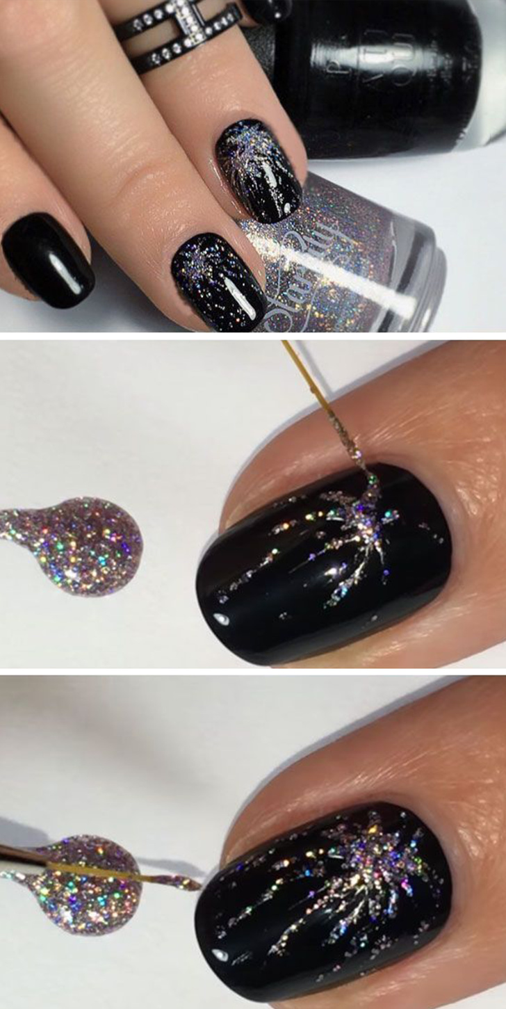 Головна умова вдалого втілення подібного дизайну — це використання в якості прикраси лаку з блискітками, так як з них непомітні огріхи, на відміну від кольорового лаку, яким потрібно вміти саме малювати, щоб вийшло акуратно.