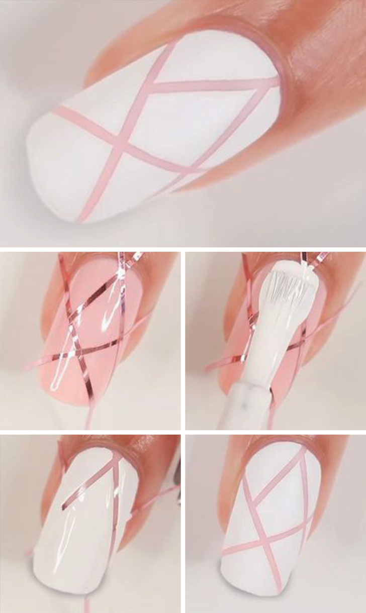 Лінії між фігурами в такому типі манікюру можуть бути як прозорими, так і кольоровими або навіть різнокольоровими. Залежить від того, якого кольору буде базовий шар. В даному випадку він рожевий: