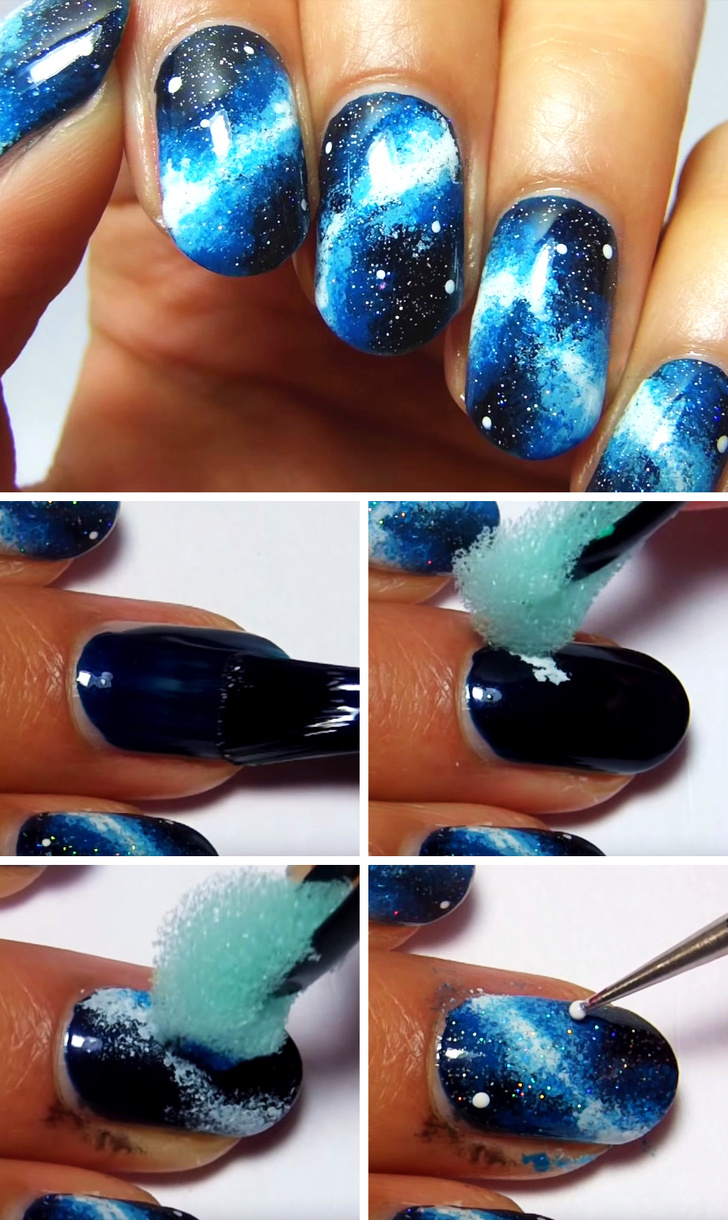 Для створення таких міні-галактик на нігтях вам знадобиться трохи більше досвіду і посидючості, але результат того вартий.