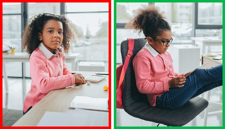 Скільки разів мами повторюють дітям: «Сядь прямо!» Але, виявляється, сидіти за столом прямо, це не найкраща ідея. Дослідження показали, що та зручна поза, яку ми інстинктивно приймаємо, відкидаючись на спинку стільця і трохи з'їжджаючи вниз, і є сама корисна. Коли ми сидимо під кутом 135°, на диски хребта, а також на пов'язані з ними м'язи і зв'язки виявляється найменша навантаження.