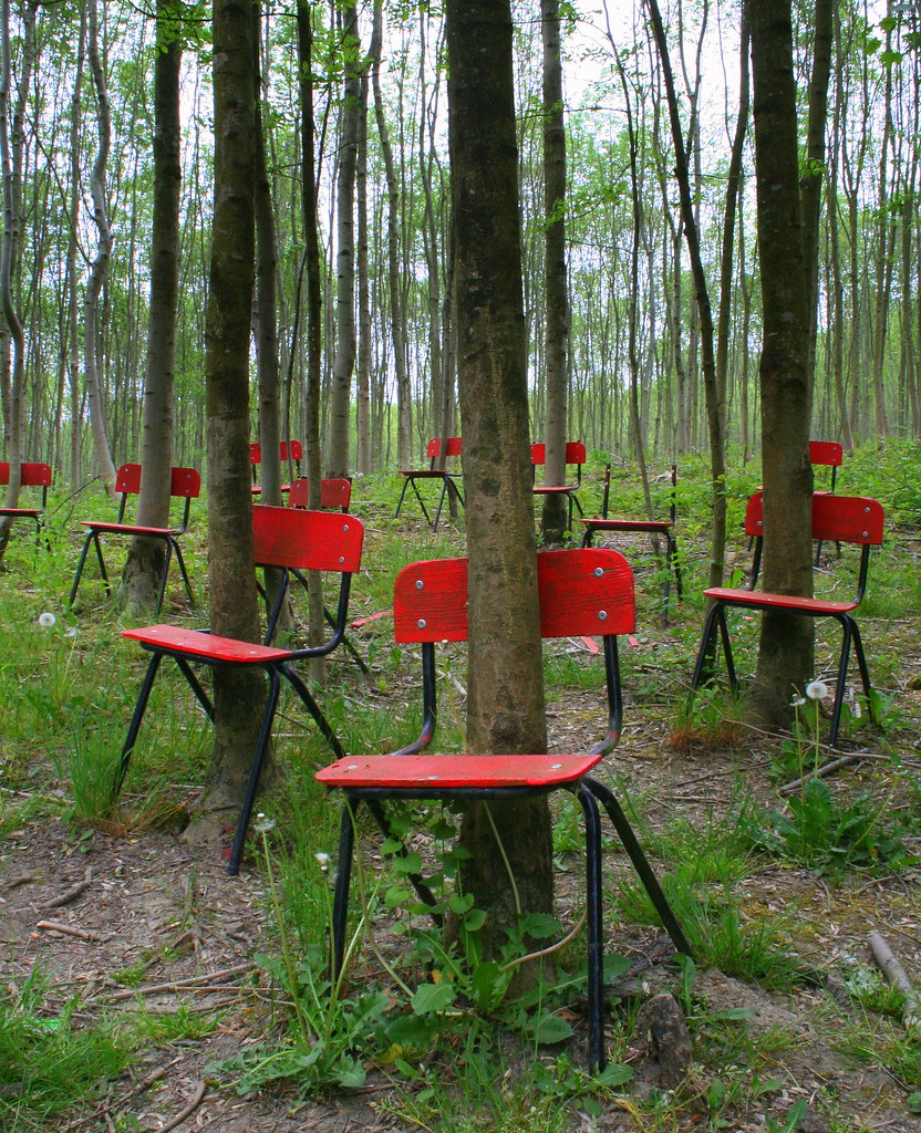 А цей популярний знімок завжди супроводжують жалісним текстом: «Ці стільці були розкладені в 1939 році в Польщі для проведення весільної церемонії. З-за німецького вторгнення весілля довелося терміново скасувати, а стільці кинути. Через багато років вони були знайдені в лісі, причому крізь кожен стілець проросло дерево. З тих пір стільці кожен рік підфарбовують».