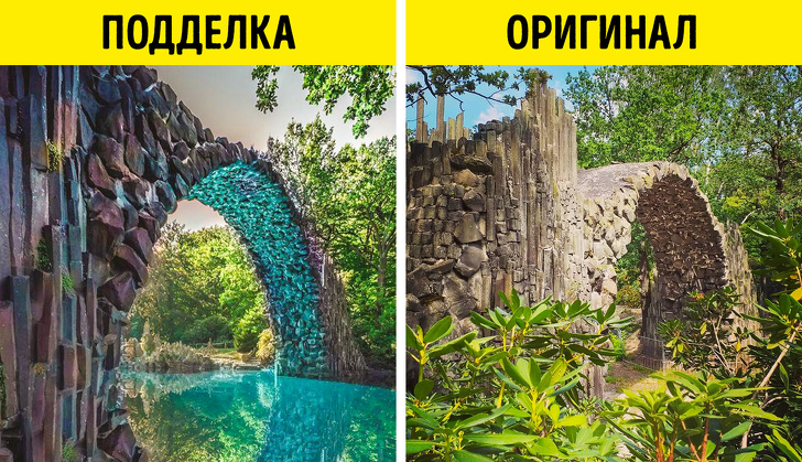 Знаменитий міст Ракотцбрюке, розташований у Німеччині посеред парку Кромлау, дійсно виглядає дуже красиво, але не так казково, як на відредагованому фото. Водна гладь озера теж має зовсім звичайний колір, причому озеро іноді майже повністю висихає.