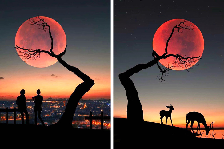 В інтернеті стали популярні зображення, на яких відображені вдалі ракурси Місяця. Насправді ці роботи виконані на комп'ютері. Приміром, силуети людей, тварин — це стічні картинки. Втім, як і дерево з Місяцем. Зверніть увагу, що вони однакові і просто дзеркально відбиті.