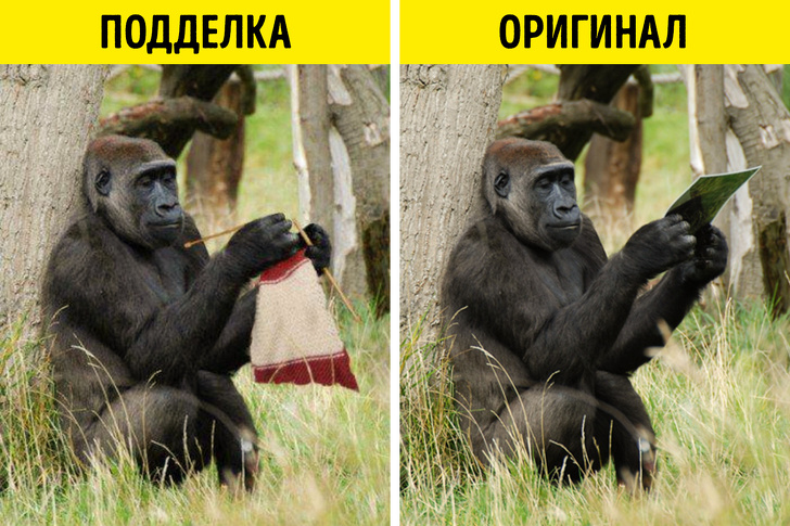 Фотографія горили, в'язкий собі шарф, популярна вже кілька років. Наприклад, на одному з сайтів кажуть, що співробітник зоопарку випадково забув у вольєрі горил пряжу, спиці і журнал про в'язання гачком, а через деякий час з подивом виявив, що примат на ім'я Пенні зв'язав собі частину шарфа. І нібито цей випадок привернув увагу вчених всього світу.
