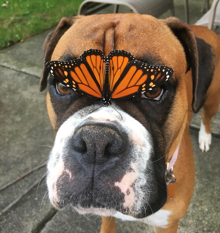 В кінці минулого року вірусним став знімок собаки породи боксер, на морду якого села велика метелик. «Сьогодні мій боксер знайшов нового друга» — свідчить підпис. Фото абсолютно реальне, а ось опис не відповідає дійсності, так як комаха напевно вже навряд чи коли-небудь злетить.