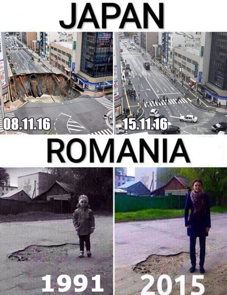 Нещодавно на Reddit став популярним мем, де порівнюють швидкість роботи японських і румунських шляховиків. Так, в японському місті Фукуока в листопаді 2016 року дійсно стався великий провал ґрунту на 5-смуговий шосе. А вже через тиждень все було відремонтовано. Для порівняння показано яма на одній з доріг Румунії, яку не можуть залатати 25 років.