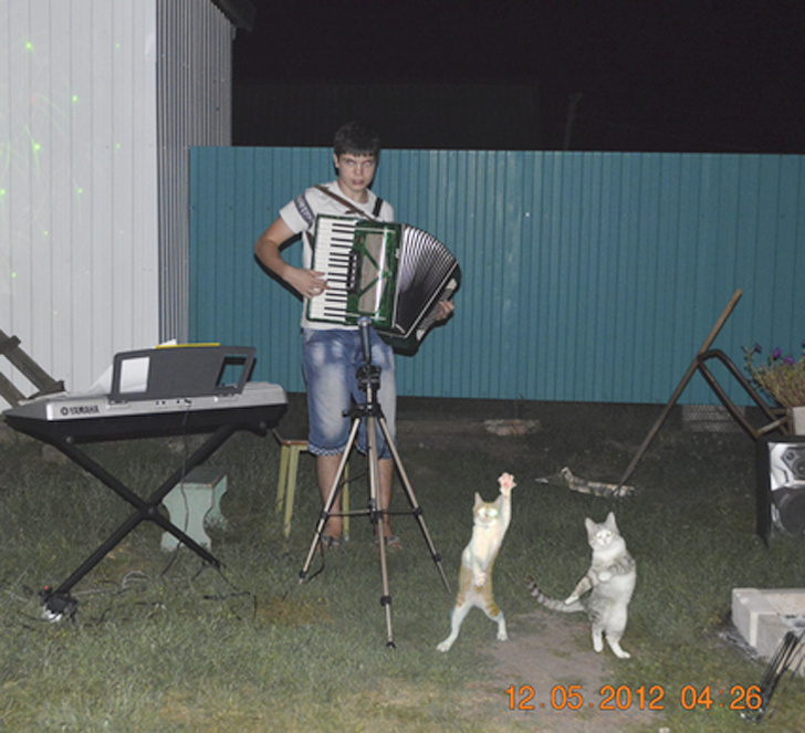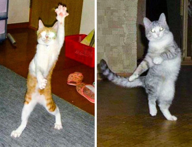 Ця відома в Рунеті фотографія популярна і на зарубіжних сайтах. Найчастіше її супроводжують текстом «Якщо ваша вечірка не схожа на це, навіть не намагайтеся мене запрошувати». Здається, ніби ці коти виконують якийсь дикий танець, але насправді це колаж.