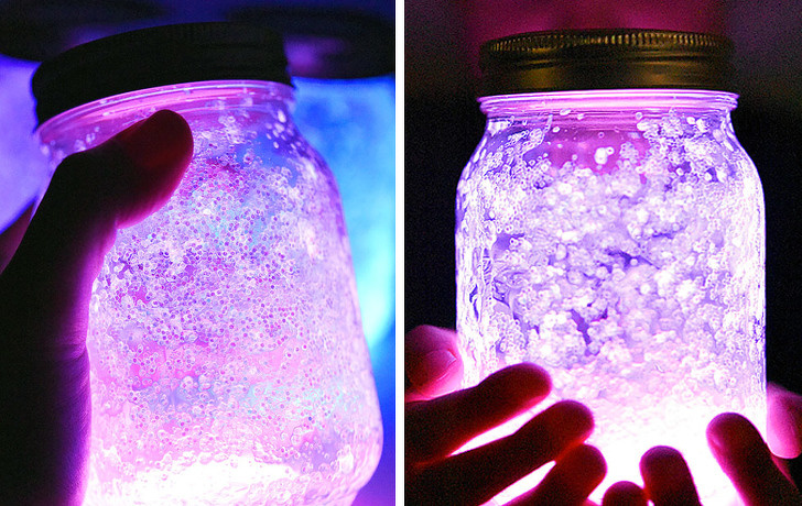 Щоб зробити таку блискучу баночку, яка цілком може служити заспокійливим елементом для дітей, які бояться спати в повній темряві, вам знадобляться всього 3 речі: досить товста люмінесцентна паличка, блискітки і банку. Рідина з палички потрібно вилити в банку, засипати блискітками і акуратно розподілити по стінках. Ілюстровану покрокову інструкцію можна подивитися тут.