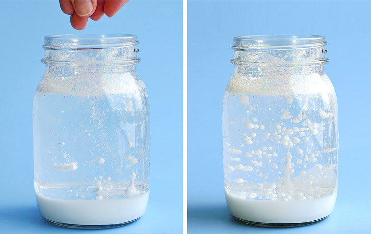 Щоб провести такий чарівний і заспокійливий експеримент, як на фото, вам знадобиться дитяче масло, блискітки, біла фарба і Алка-Зельтцер. Банку заливають маслом на 2/3, решту третину наповнюють водою, змішаної з фарбою, і нарешті покривають поверхню блискітками. Далі розламують таблетку Алка-Зельтцера, кидають маленькі шматочки в банку — і можна спостерігати за чарами. Більш детальну інформацію ви можете прочитати за посиланням.