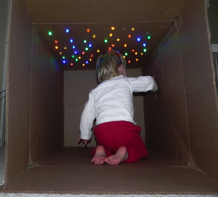 Щоб створити будиночок приблизно як на фото, достатньо виділити велику непотрібну коробку, а далі все обмежується тільки вашою спільної фантазією. Можна вирізати віконця, постелити пишне покривало і розкласти подушки, дати дитині фломастери, щоб він сам прикрасив стінки. Ну, а вишенька на торті — це освітлення, яке можна організувати, зробивши дірки в верхній частині коробки і просунувши в них лампочки від гірлянди. Ще пара фото тут.