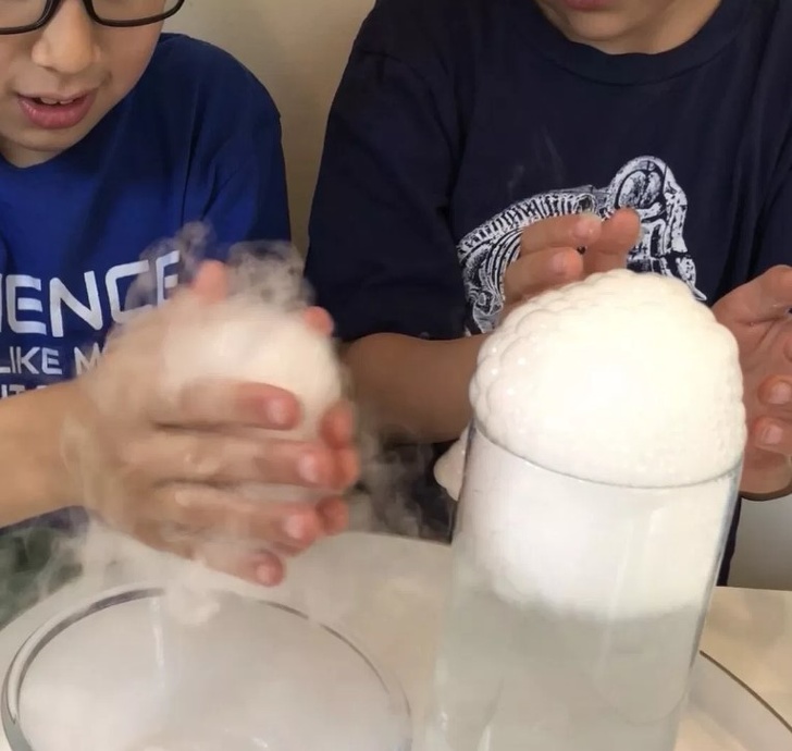 Піна, яка при схлопуванні перетворюється в багату серпанок, створюється лише за допомогою 3 інгредієнтів. Наповніть високу ємність на 2/3 теплою водою і додайте миючий засіб. Кухонними щипцями (важливо: не торкатися голими руками щоб уникнути опіку!) акуратно додайте в цю мікстуру шматочок сухого льоду. Підніметься піна, яку можна чіпати і перетворювати в дим. Прочитати більш докладні коментарі ви можете тут.
