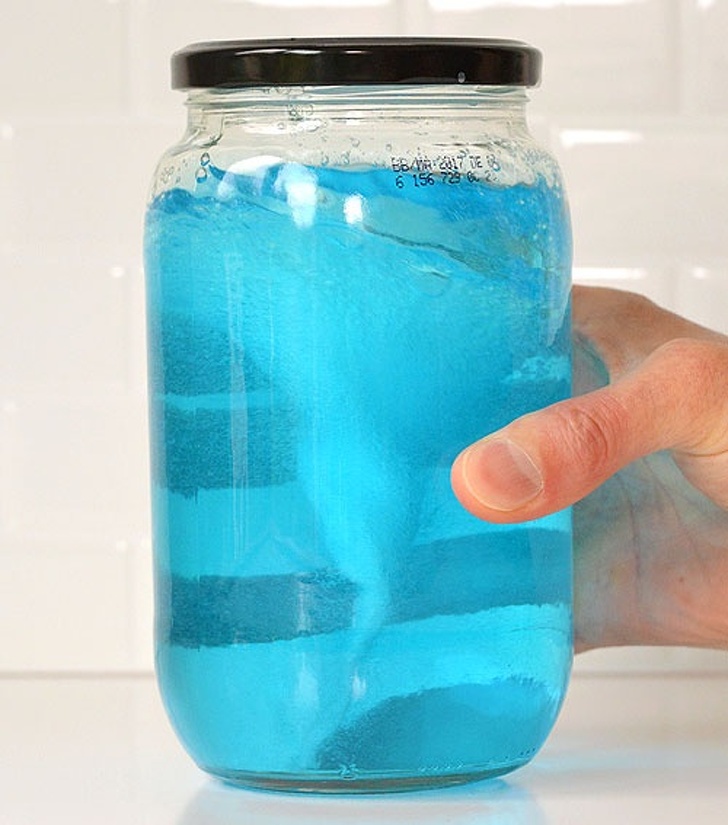 Для цього експерименту вам знадобиться кілька простих інгредієнтів і 5 хвилин часу. Налийте в банку воду, додайте щедру порцію засобу для миття посуду і пару крапель харчової фарби. Щільно закрутіть кришку і почніть обертати банку круговими рухами як можна швидше, поки не сформується торнадо. Якщо бульбашок виходить занадто багато, додайте трохи оцту. Почитати про це в подробицях ви можете тут.