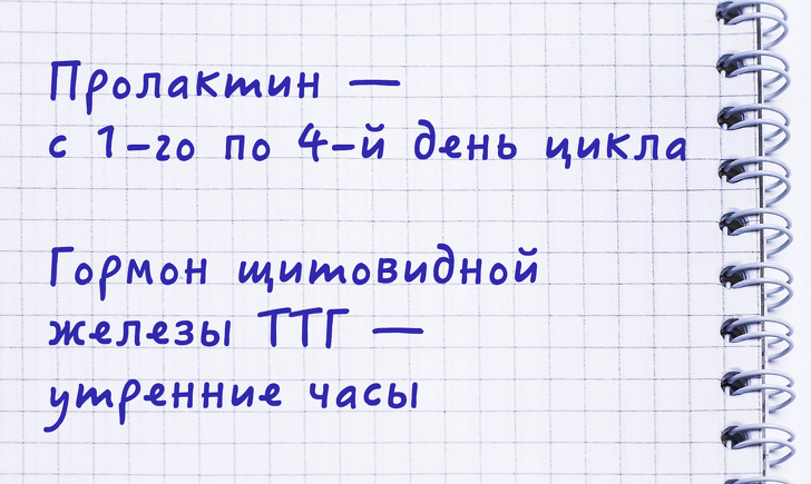 Наприклад, аналіз на рівень гормону щитовидної залози ТТГ потрібно здавати в ранковий час, з 8:00 до 10:00, обов'язково натщесерце і в максимально спокійному емоційному стані. Статеві гормони: прогестерон — у 2-й фазі циклу на 21-й день, пролактин — на 1-4-й день циклу за рекомендацією гінеколога, естроген — 5-7-й день циклу.
