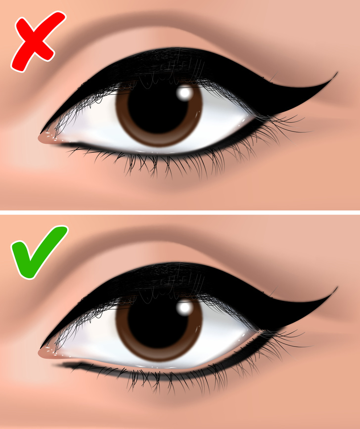 Шар підводки або олівця на внутрішньому контурі нижнього століття надає макіяжу закінчений вигляд. Але, якщо ви носите контактні лінзи або ваші очі відрізняються чутливістю, будьте акуратні. Найдрібніші частинки косметики скупчуються на слізної плівці і можуть подряпати очей або лінзу, викликати дискомфорт. У деяких випадках можна навіть отримати очну інфекцію.