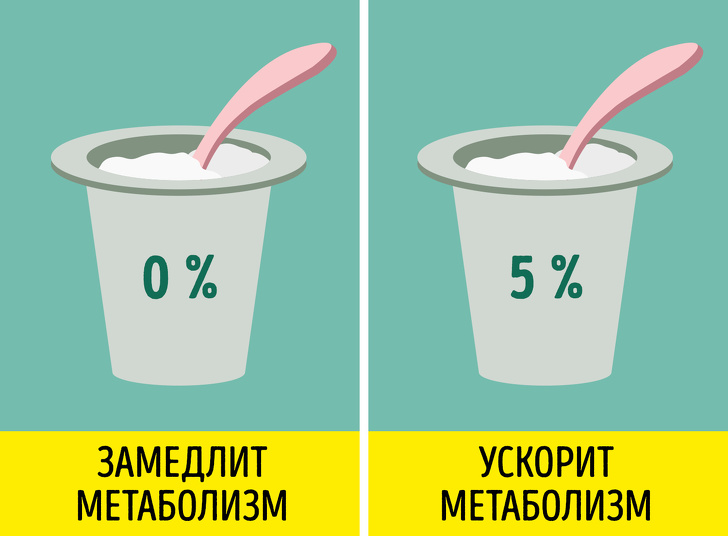 Відомо, що дієта з низьким змістом жирів і присутність в раціоні знежирених продуктів уповільнюють метаболізм. І роблячи вибір на користь того чи іншого продукту, потрібно звертати увагу не на його жирність, а на калорійність та кількість з'їденого. Дієтологи також відзначають, що продукти з написом «знежирений» ми готові споживати в більшій кількості.