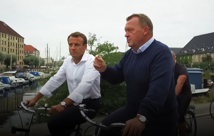 Президент Франції Еммануель Макрон і колишній прем'єр-міністр Данії Ларс Расмуссен на велосипедах.