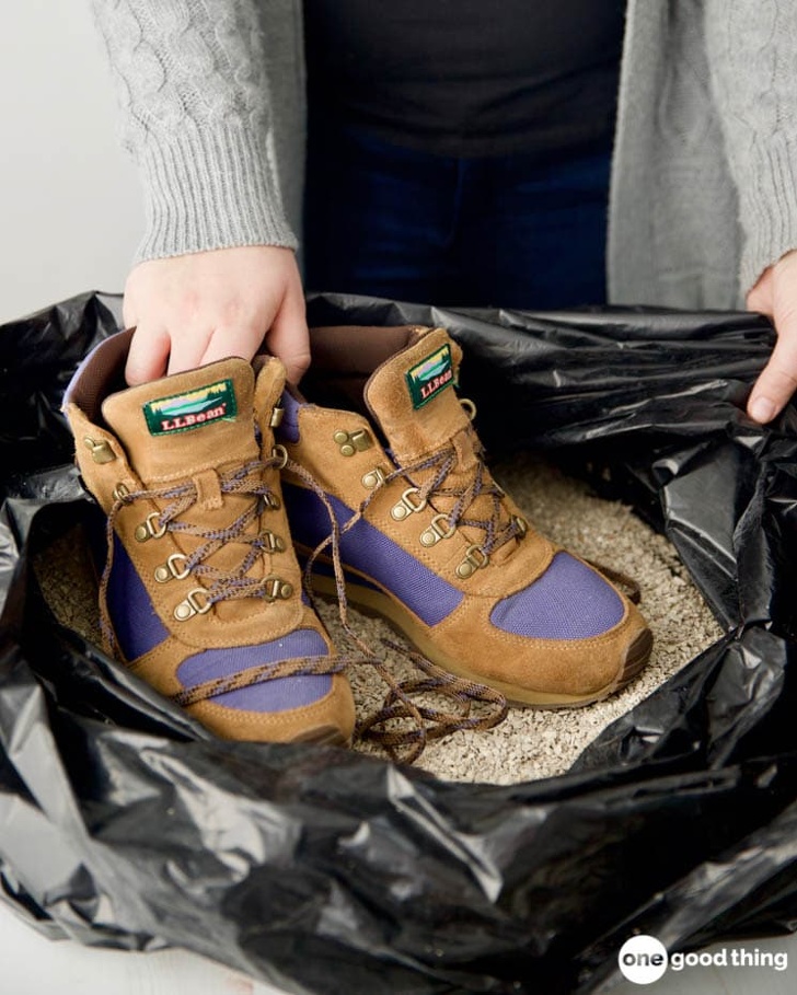 Покладіть в мішок для сміття трохи наповнювача для котячого туалету і помістіть туди предмет, який хочете дезодорувати. Це може бути взуття, лежанки для тварин або килимки — все, що погано піддається пранню. Зав'яжіть пакет і залиште на строк від одного до декількох днів. Подробиці тут.