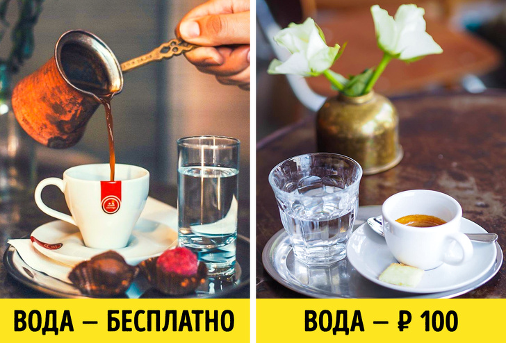 Ви замовляєте кави по-східному, до якого безкоштовно покладається склянку води. Але хитрий офіціант спробує замінити його на позицію меню і запитає, чи принести вам мінеральну воду з газом або без. Якщо не уточнити, що потрібна звичайна вода до кави, ви заплатите за два напою замість одного.