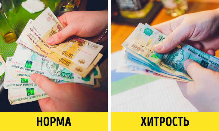 Зазвичай офіціант кладе здачу так, щоб купюри лежали по порядку. Але якщо гроші перемішати і покласти пару середніх купюр між дрібними, гість може не помітити цього і залишити їх разом з дріб'язком «на чай офіціантові. Розрахунок простий: більшість чоловіків на побаченнях або ділових зустрічах рідко уважно перераховують здачу.