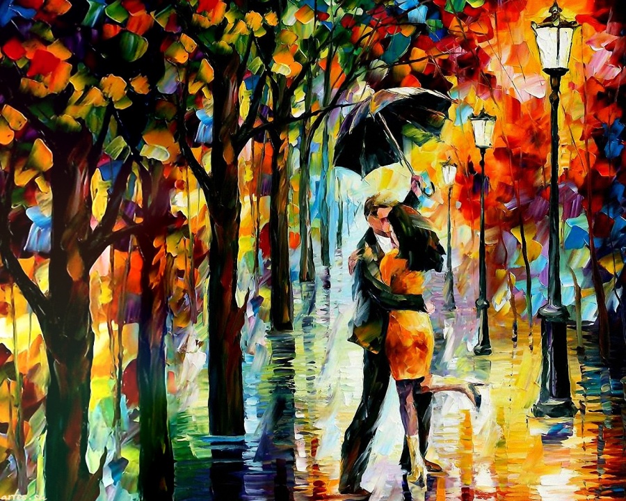 Художній стиль Леоніда Афремова унікальний і простий. Леонід використовує мастихін замість пензля. Палітра — сам ніж, яким художники користуються для видалення фарби з полотна. Колірна палітра його картин видає в художника закоренілого оптиміста, всім серцем закоханого в навколишній світ.