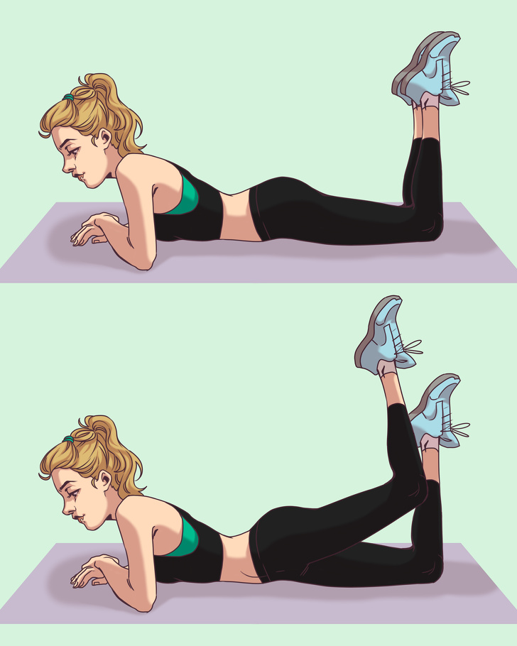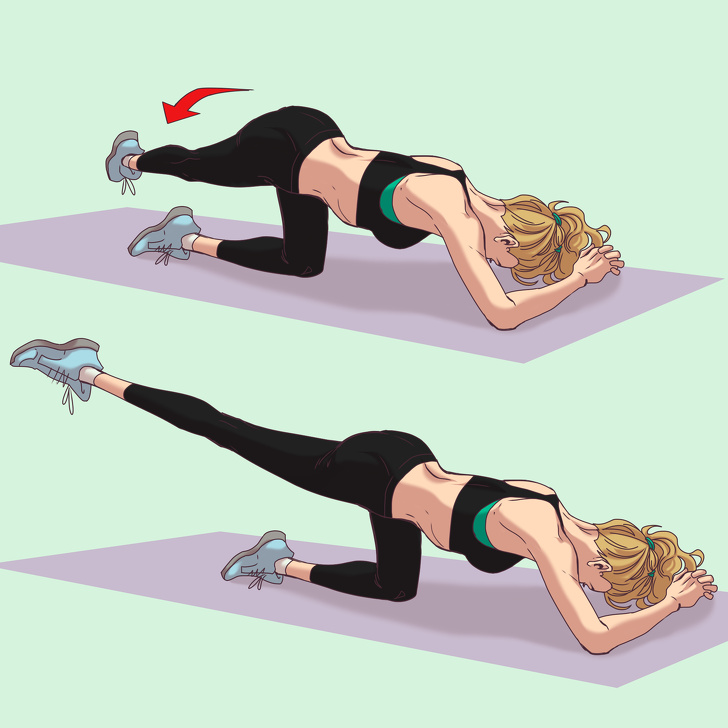 - Встаньте на коліна і зіпріться на лікті, одну ногу підніміть вгору до паралелі з підлогою.