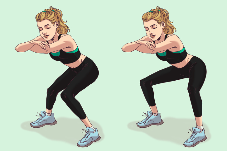 - Зробіть присідання, сідниці відведіть назад і зведіть коліна.
