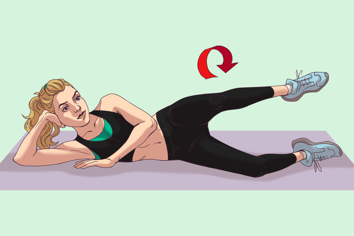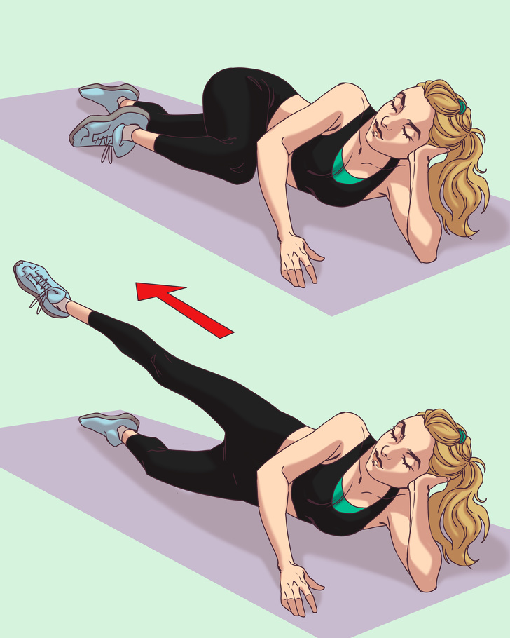 - Лежачи на боці, зігніть ногу в коліні і підніміть її вгору.
