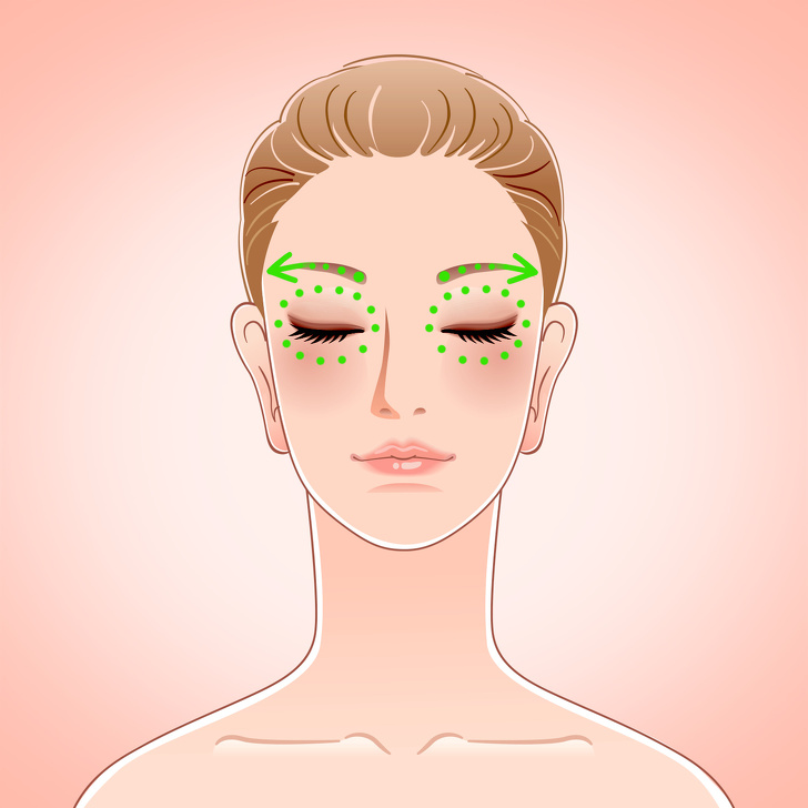 - Вказівним пальцем правої руки притримуємо шкіру біля основи лівої брови. Трохи згинаємо вказівний палець лівої руки і як би «проїжджаємо» його бічною стороною по всій брови, натискаючи на неї з середньою інтенсивністю і злегка піднімаючи вгору. Проробляємо те ж саме з правою бровою. Повторити по 10 разів для кожної брови.