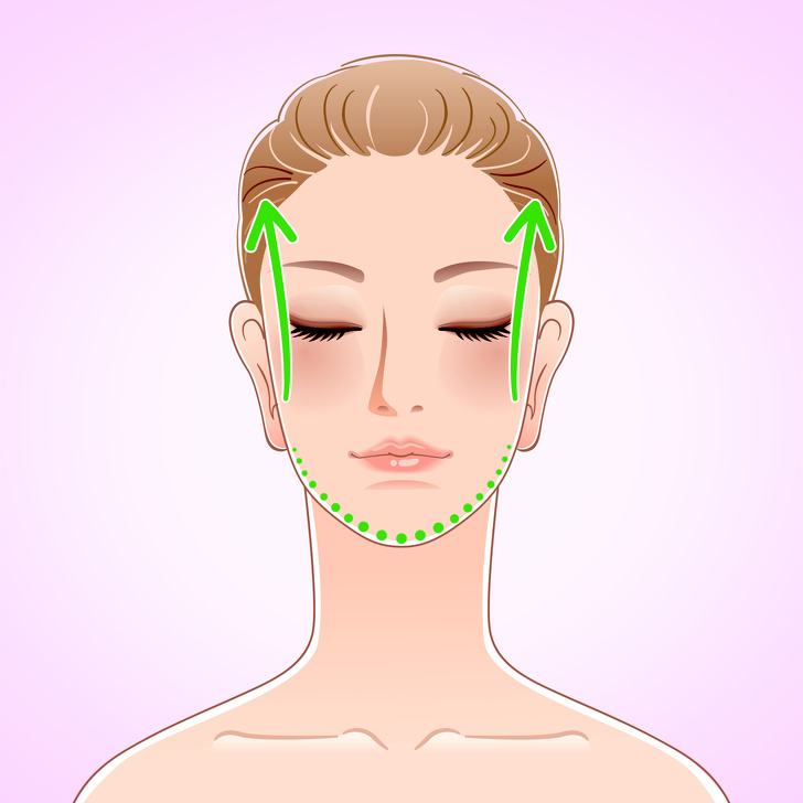 - Маємо руки на обличчі так, щоб середини долонь були притиснуті до вилиць, а пальці — до скронь. Повільно просуваємо долоні вгору до верхівки голови, в результаті з'єднуючи їх там. Повторити 3 рази.