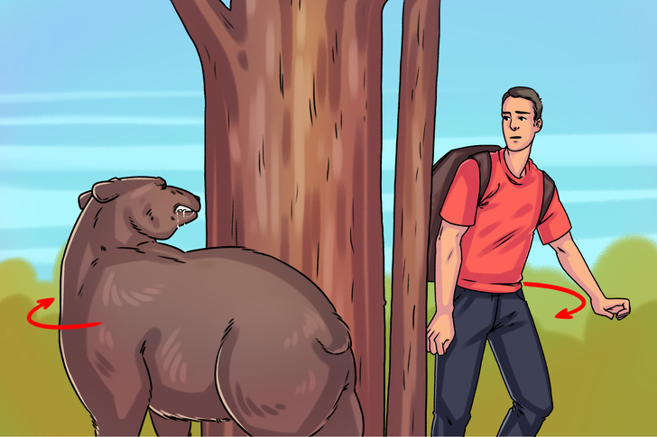 Краще, звичайно, взагалі уникати ведмедів в дикій природі, але, якщо зустріч все-таки відбулася, то знайте, що слабке місце цієї тварини — маневреність. Ведмеді швидко бігають і добре повзають — змагатися з ними в цьому безглуздо, але вправно рухатися навколо якогось об'єкта, наприклад машини або дерева, їм набагато важче. Рано чи пізно хижак залишить спроби вас зловити, бачачи, що ця хитра порція «їжі» (ви) не варто витрачених сил.