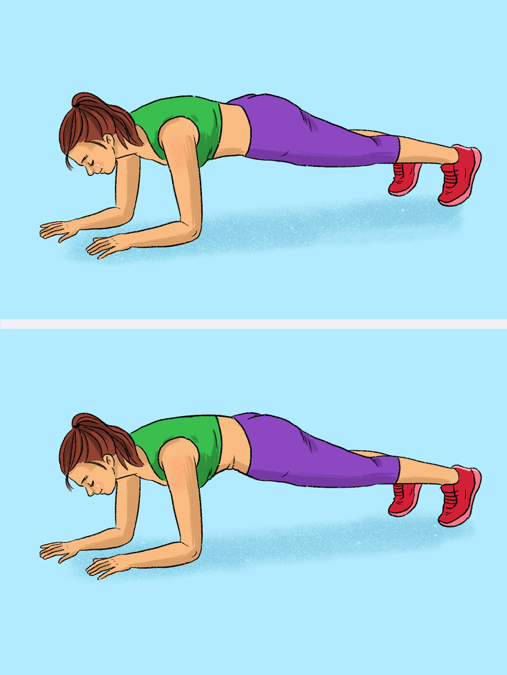 - Щільно притиснути лікті і шкарпетки на підлозі. Збільшити напражение в області преса, як би стягуючи м'язи.