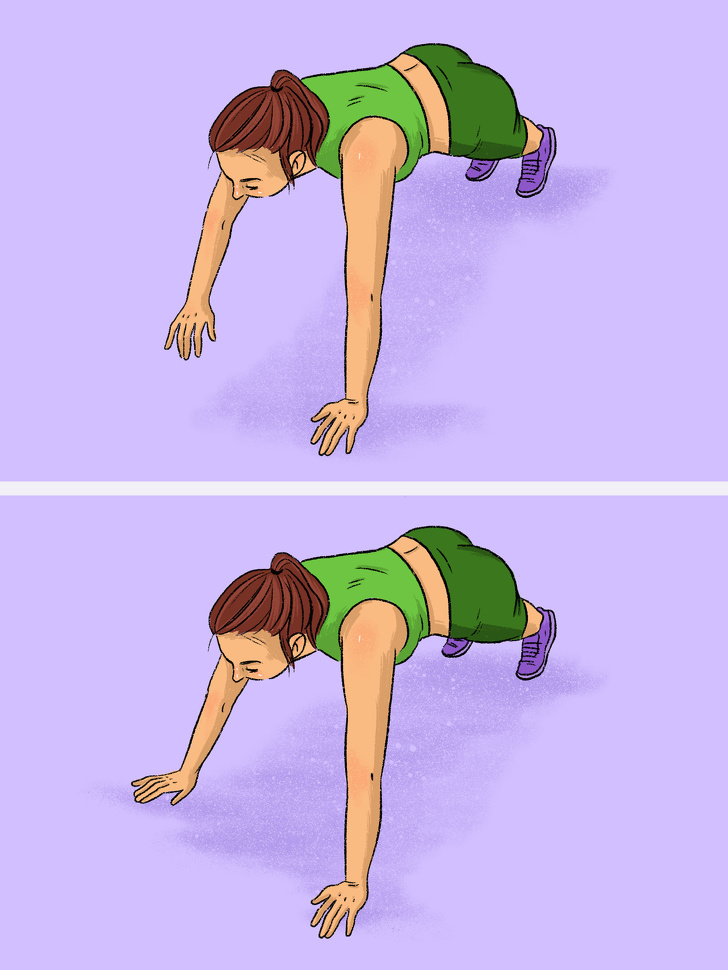 - Прибрати праву руку з підлоги і поставити долоню на те місце, де розташовувався лікоть (під плечем). Те ж саме проробити з лівою рукою.