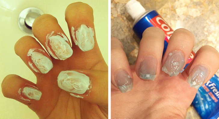 Хоча невелике пожовтіння нігтів абсолютно природно, що іноді воно виглядає не дуже акуратно. Зубна паста відмінно справляється з цією проблемою. Вона відбілює і захищає не тільки зуби, але чинить подібний вплив і на нігті, так як в їх складі теж міститься кератин.